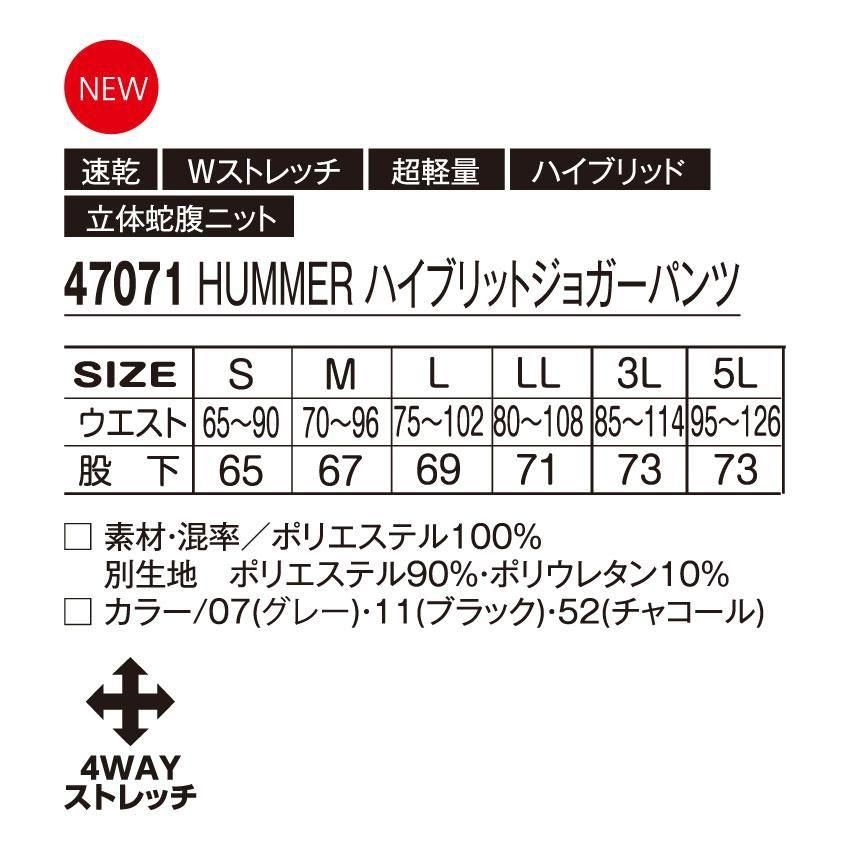 『HUMMER ハイブリットジョガーパンツ 47071』は、秋冬の作業に最適な防寒パンツです。